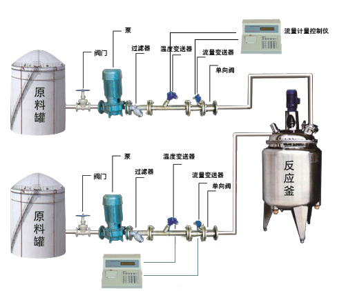 反應(yīng)釜自動(dòng)定量配料設(shè)備由液體流量計(jì)量控制儀、流量變送器、溫度變送器、平衡逆止閥(或管道單向閥)、一體式油槍(或組合式油槍)、過(guò)濾器等部件組成,液體流量計(jì)量控制儀實(shí)時(shí)采集流量變送器的體積脈沖信號(hào),通過(guò)采集溫度變送器的溫度信號(hào)實(shí)現(xiàn)對(duì)液體密度的實(shí)時(shí)溫度補(bǔ)償,從而實(shí)現(xiàn)對(duì)液體流量的高精度動(dòng)態(tài)質(zhì)量計(jì)量。